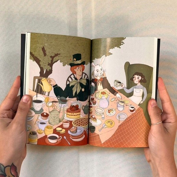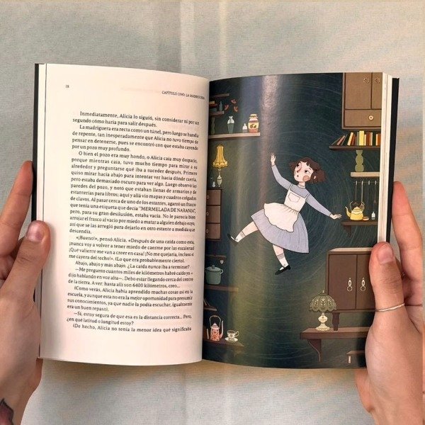 Este libro nos propone la lectura del universo creado por Carroll a través de palabras que conocemos, ya que está traducido al español rioplatense. Además, cuenta con ilustraciones a color que nos sumergen de lleno en el país de las maravillas, con sus personajes y paisajes peculiares.